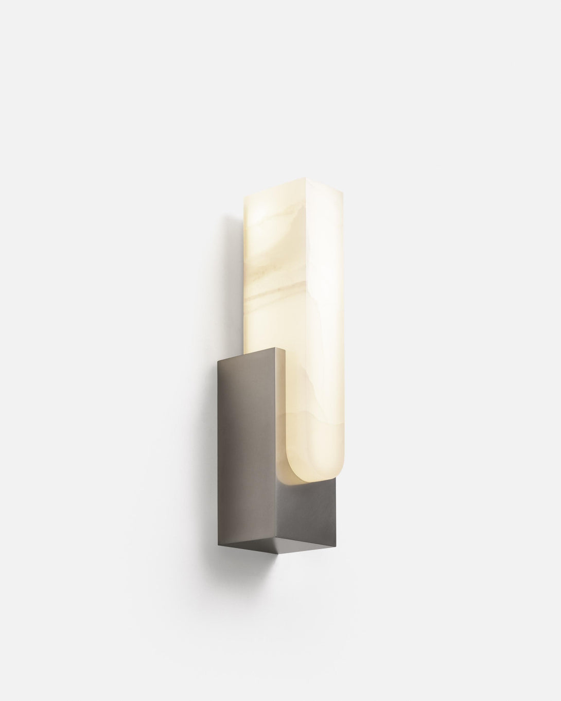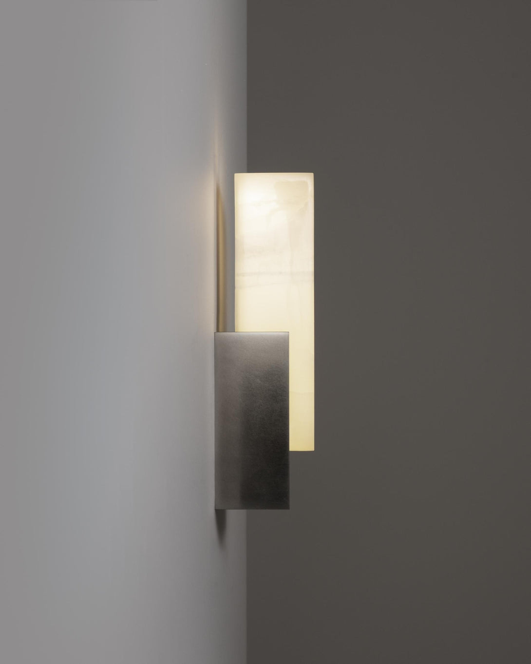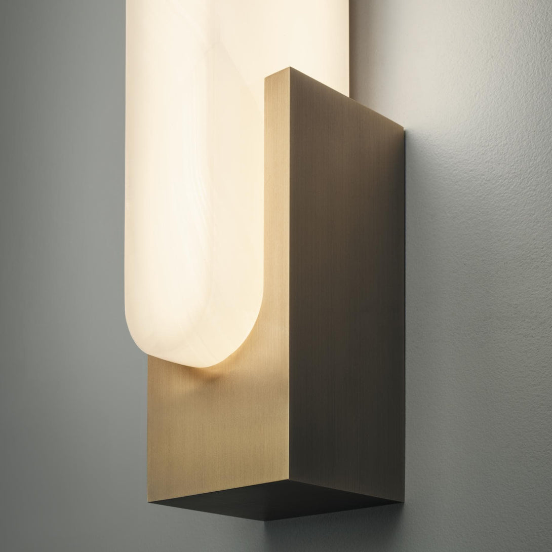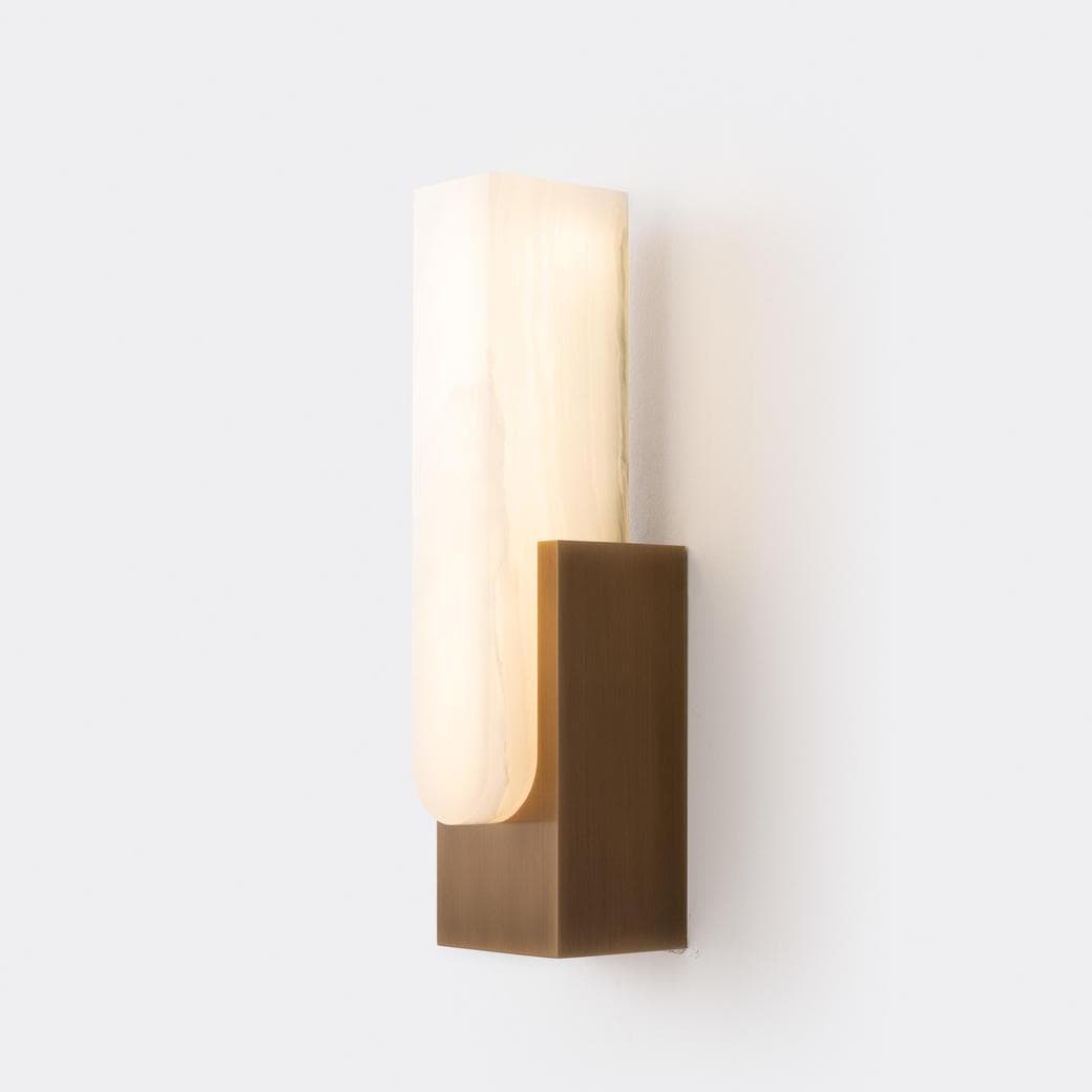 This sublimely modern light marries the purity of the metal base and the warmth of alabaster, a rare stone that makes each Agatha sconce unique. When illuminated, its inherent natural translucence comes alive, revealing veins distinct to each light.