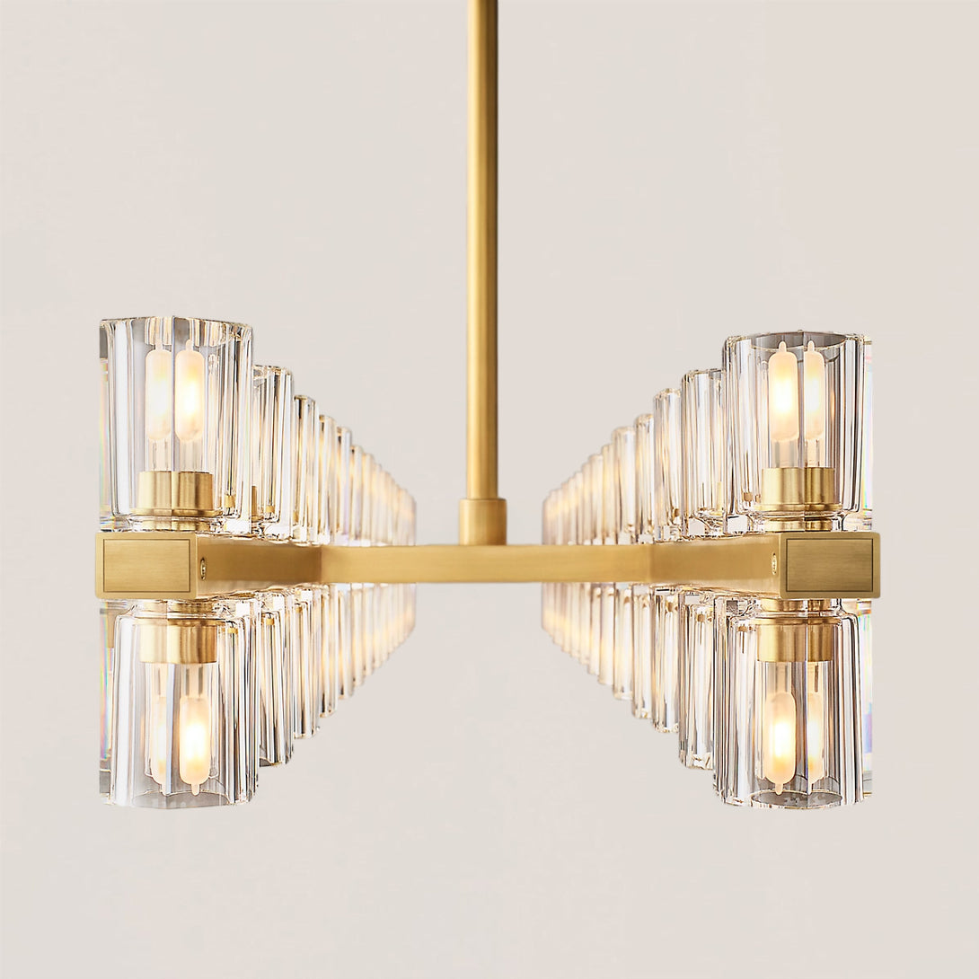 The collection is inspired by the shape and scale of industrial gears, where spokes intersperse with negative space in order to interlock with other gears. Here, the spokes are hexagonal forms juxtaposed with rounded interiors, beautifully crafted of crystal glass, running along a simple, solid metal frame.