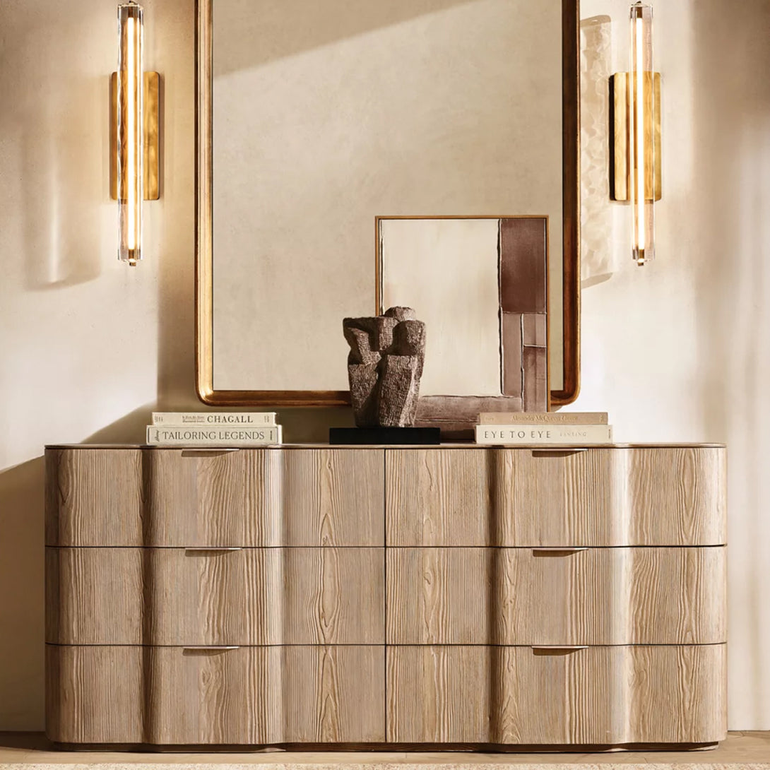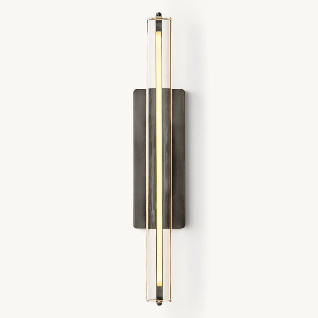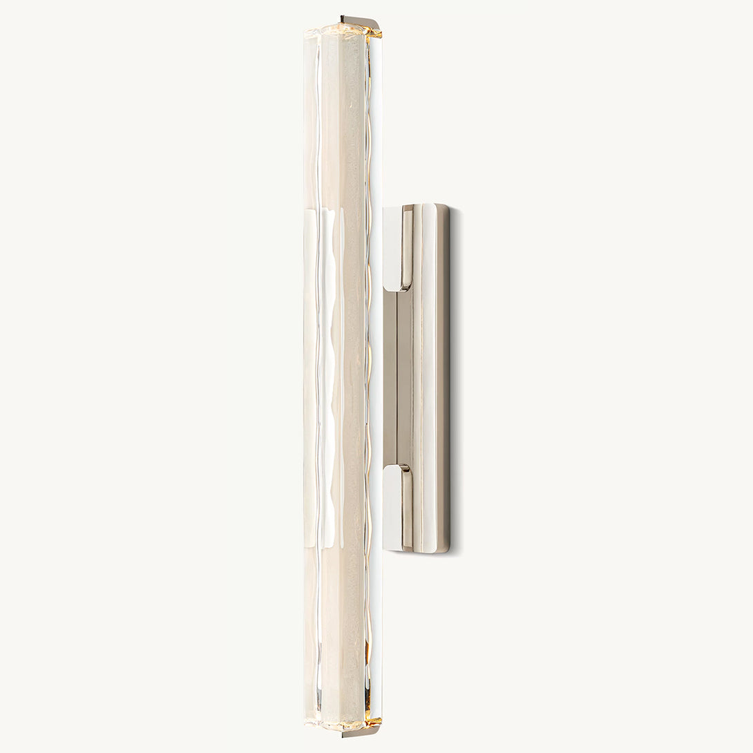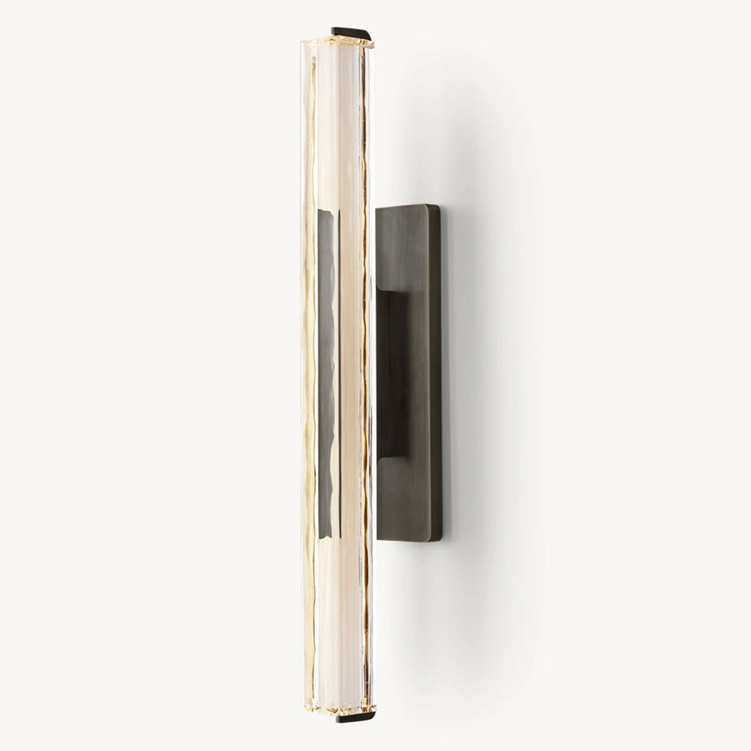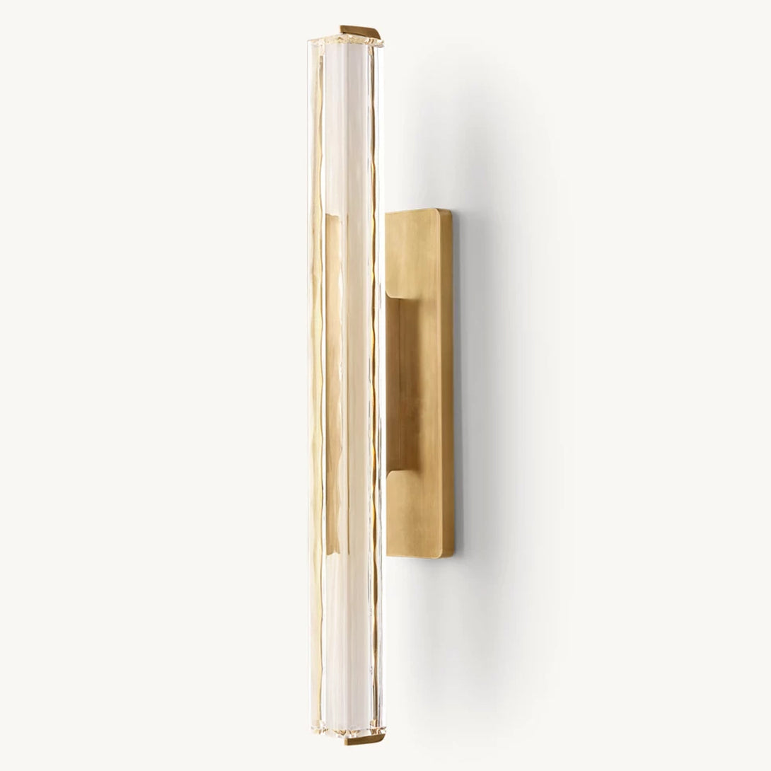 Capturing the spirit of 1960s Italian minimalism, this lighting piece features a prism of hand-polished K9 crystal suspended within a solid brass frame. Its reticulated arm artfully directs illumination to desired spaces, while an elongated LED element emulates the organic warmth of candlelight. The design masterfully balances bold geometry with subtle restraint, as textured glass refracts light into undulating patterns that enhance any environment with both functional task lighting and sculptural elegance.