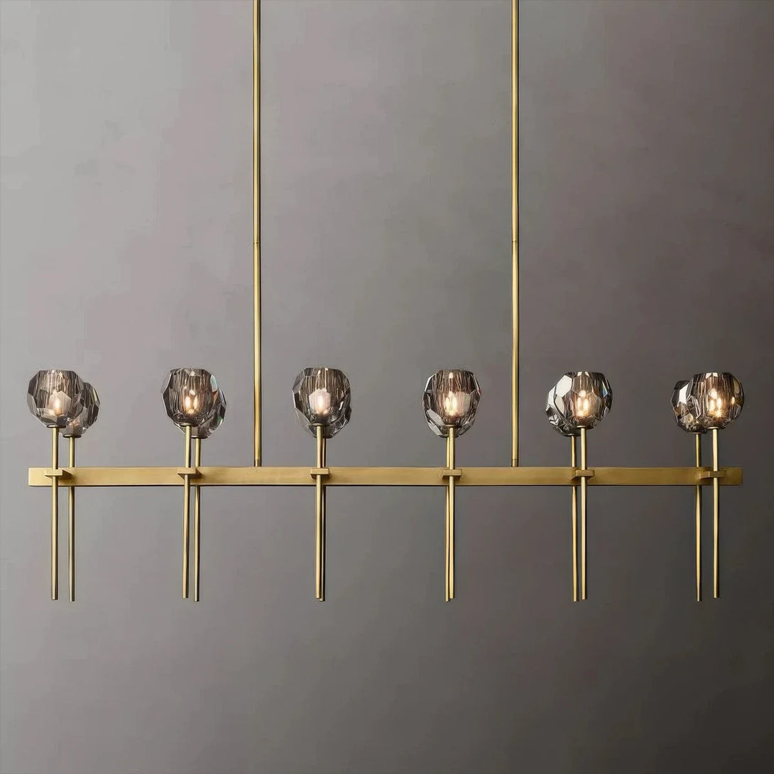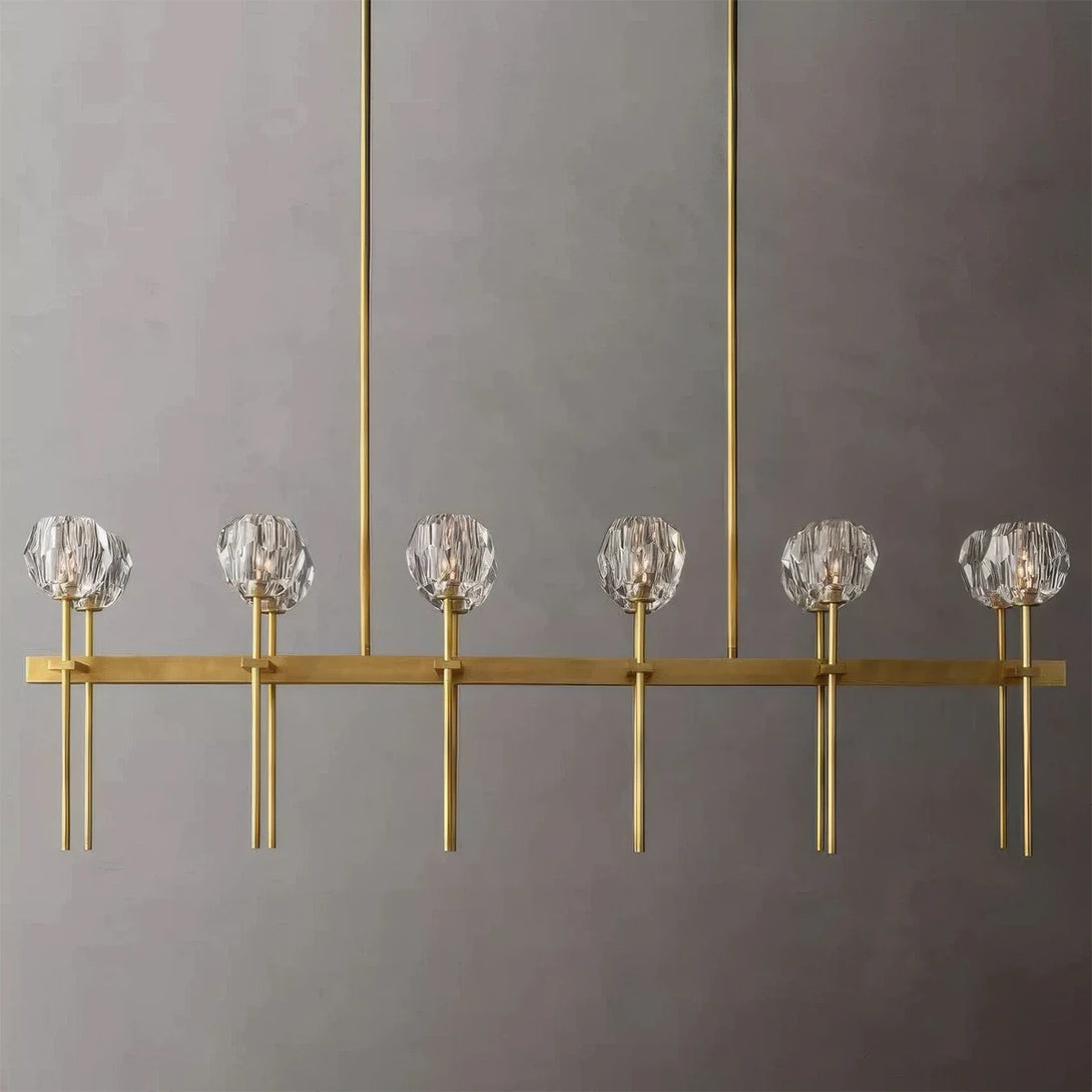 Crafted of solid brass and crystal glass, the sculptural fixture is a testament to our passion for luxe materials and superior craftsmanship. Evoking the minimalist spirit of 1960s design, each finely faceted sphere is ground and polished by hand to reflect and refract the light.
