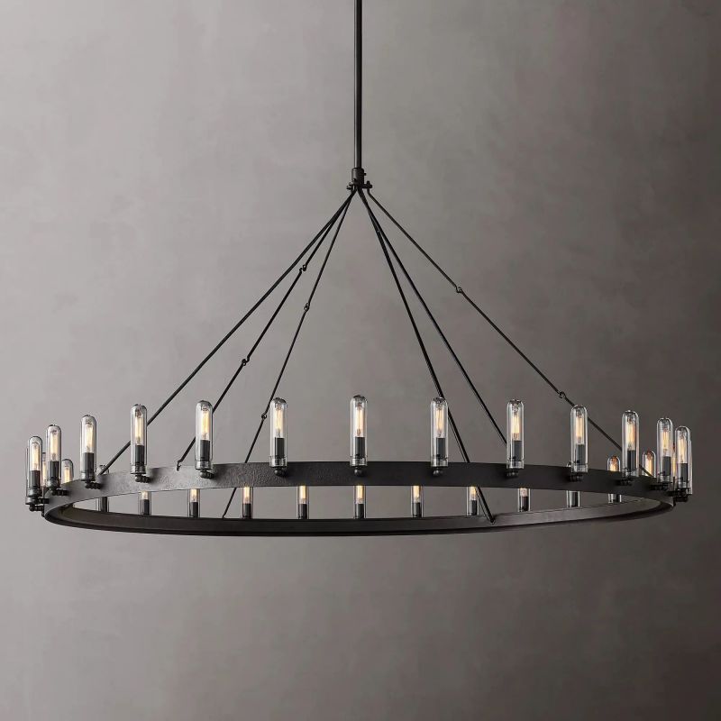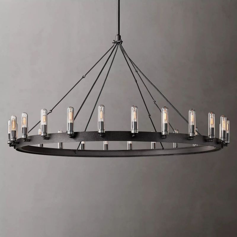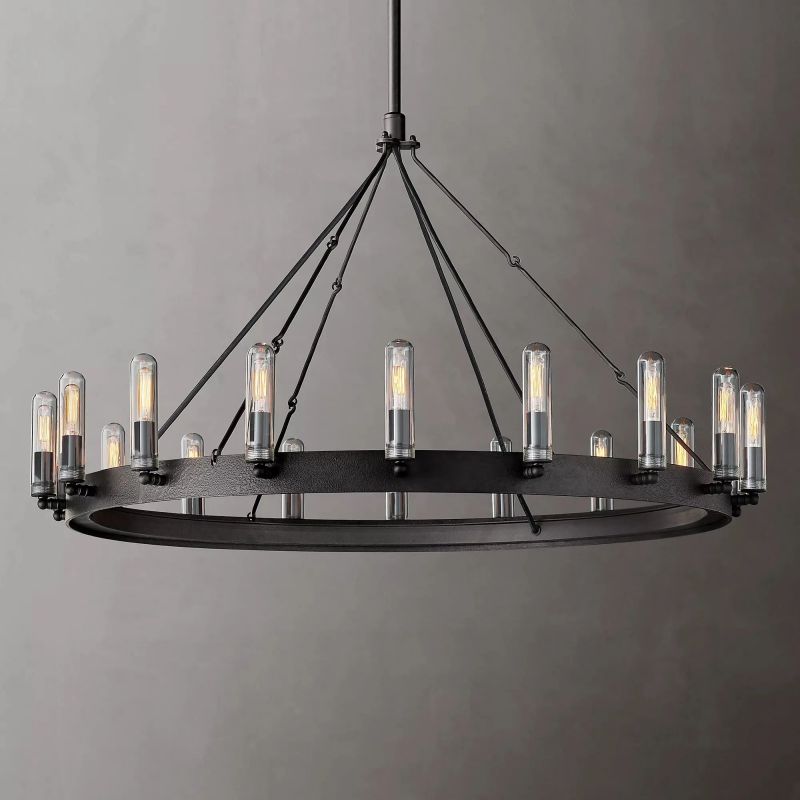 Rustic in character and industrial in construction, this round chandelier features a clean, understated silhouette. Hand-forged from solid angle iron, it draws from early 20th-century factory lighting for a timeless, utilitarian look. Suitable for dining areas, entryways, or open-concept living spaces, it complements both modern and traditional interiors.