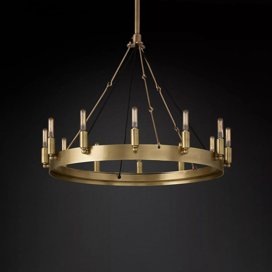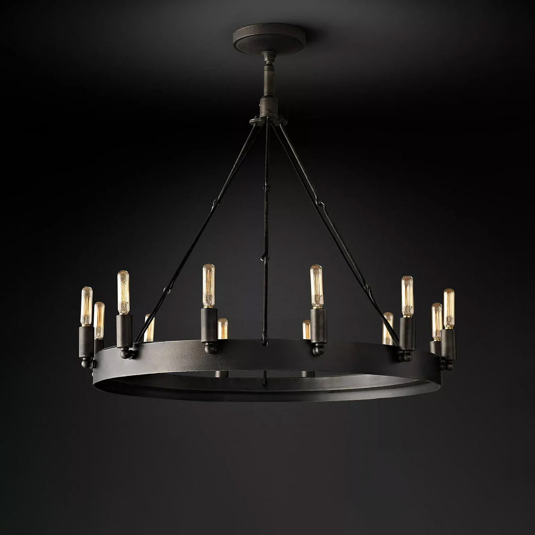 Rustic in character and industrial in construction, this round chandelier features a clean, understated silhouette. Hand-forged from solid angle iron, it draws from early 20th-century factory lighting for a timeless, utilitarian look. Suitable for dining areas, entryways, or open-concept living spaces, it complements both modern and traditional interiors.