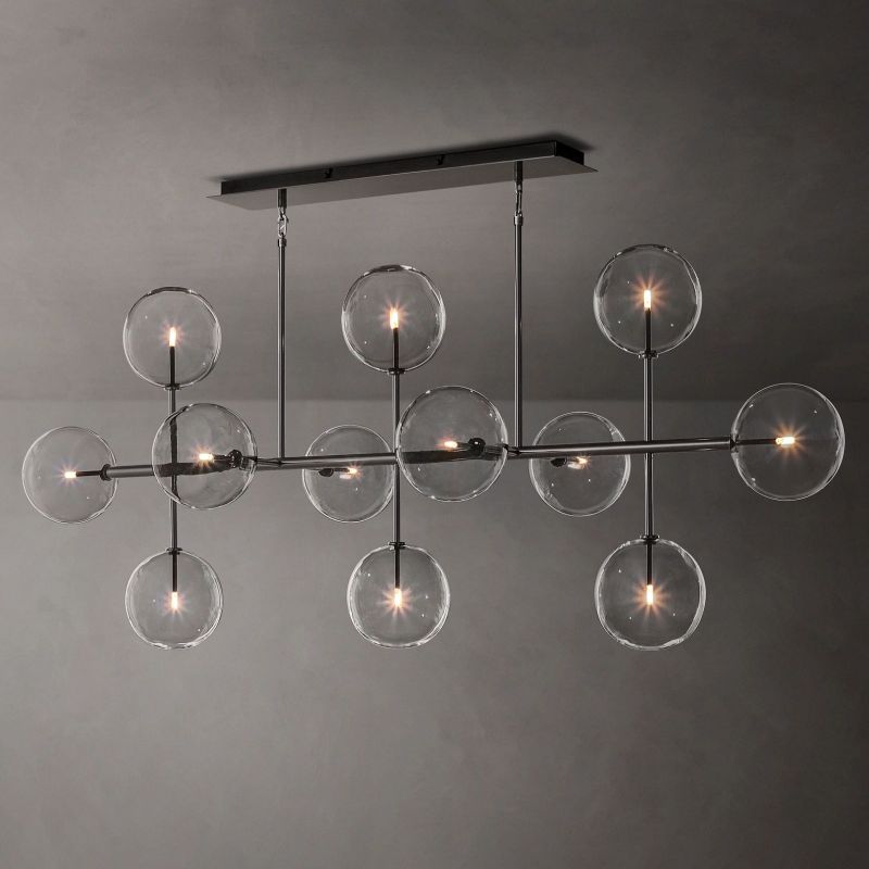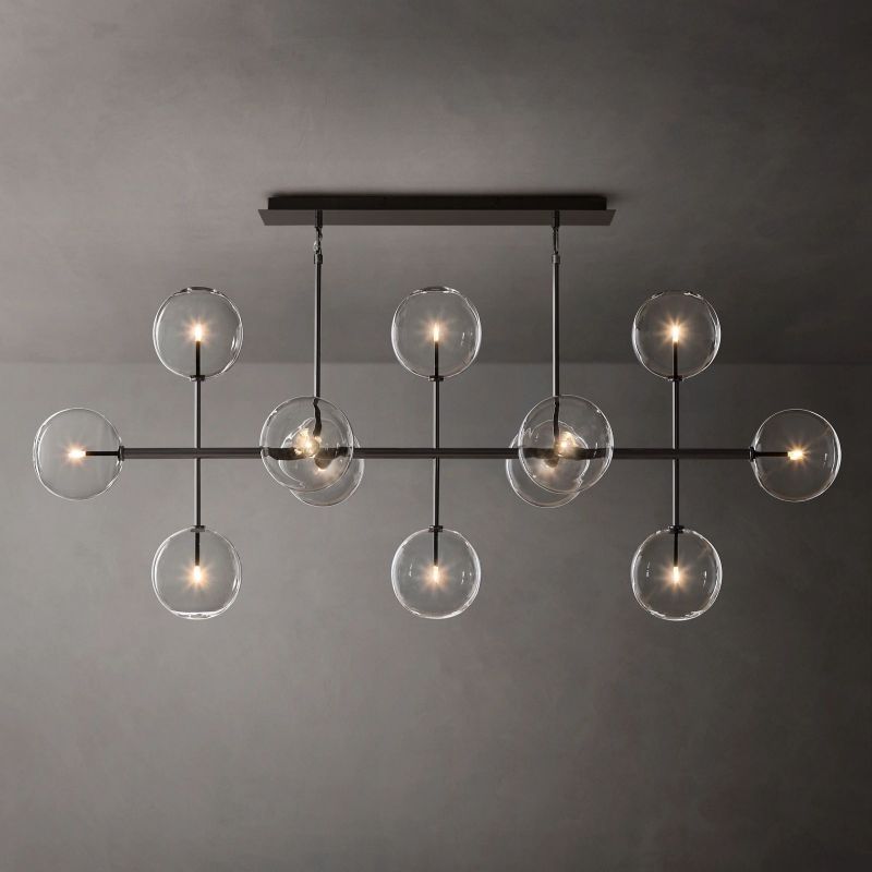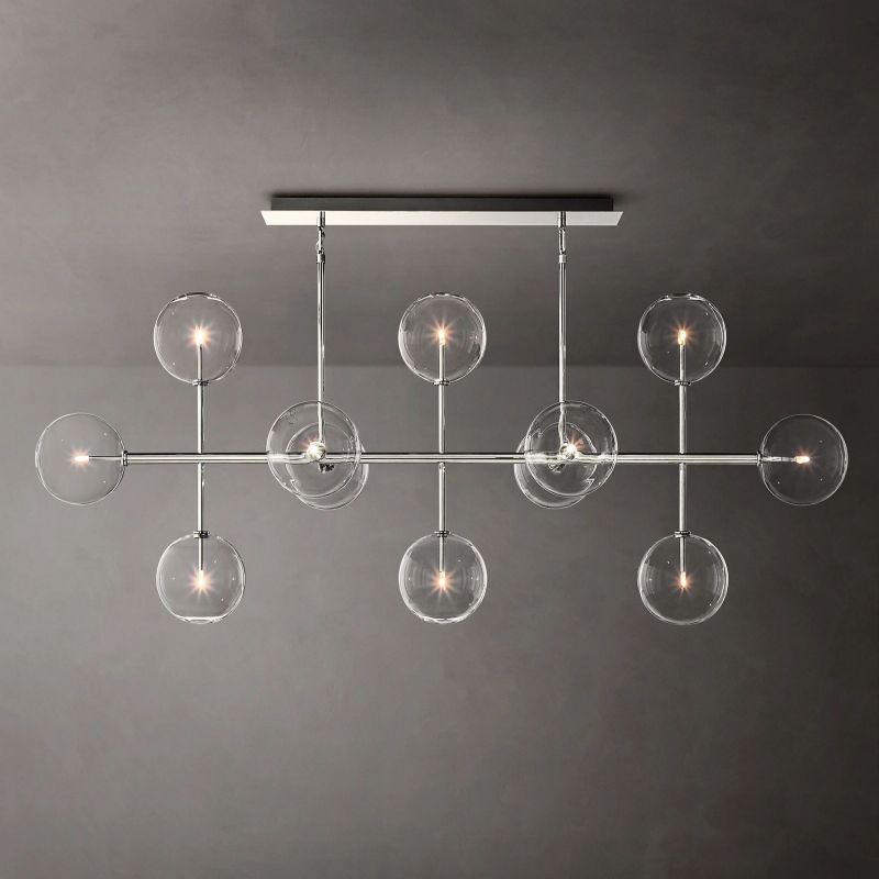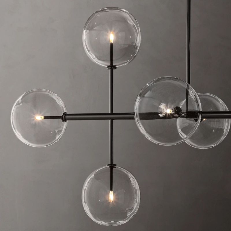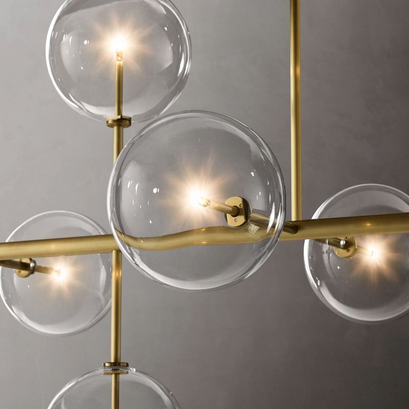 Delicate, handblown glass globes float at the ends of solid brass rods in our collection. Crafted in Poland by master glassmakers, each fixture conveys fluidity and motion yet is anchored in the pure modern architecture of its form.