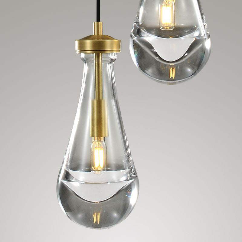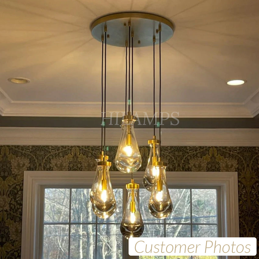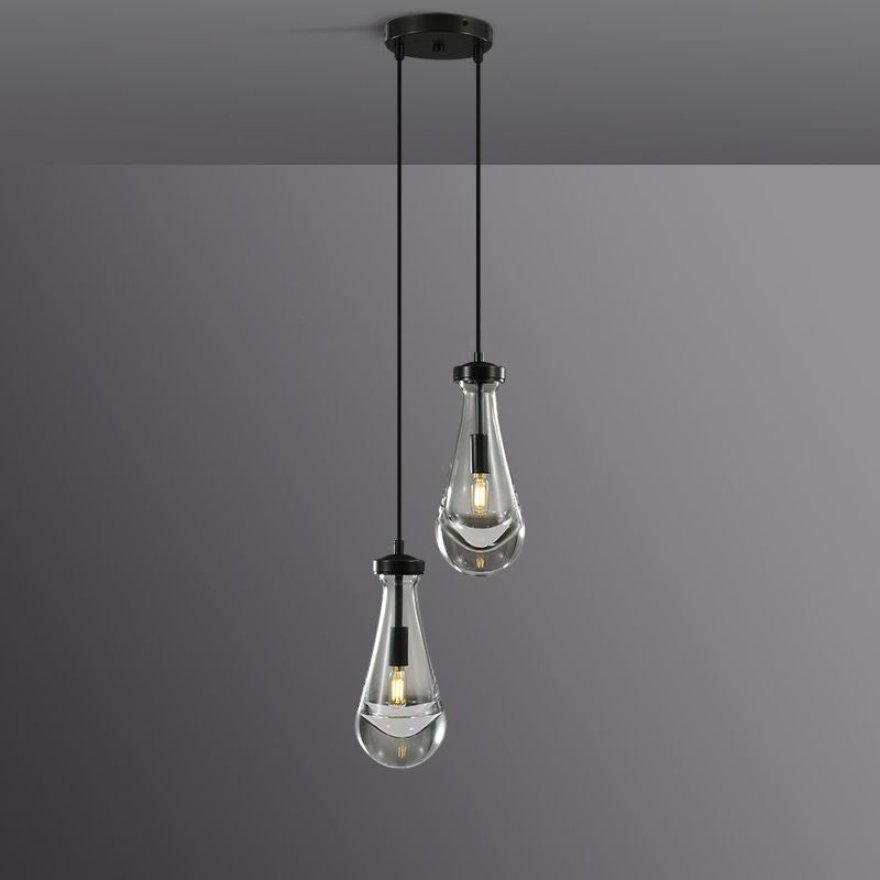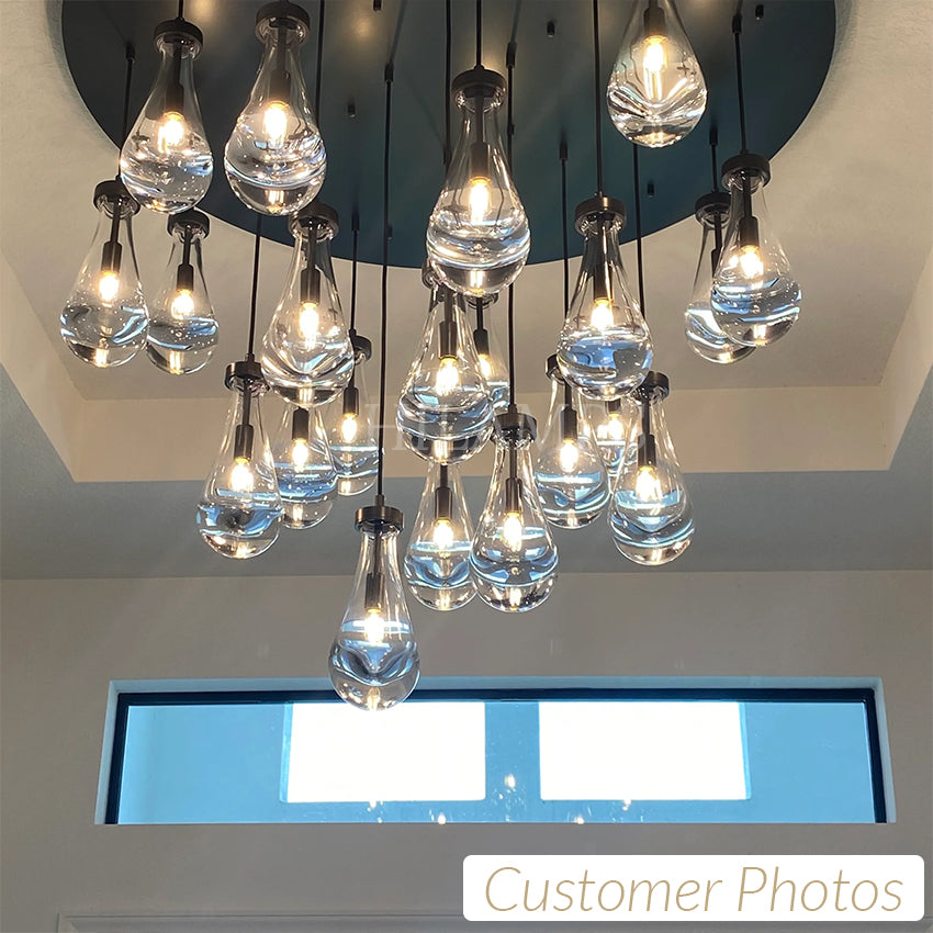 Much like the rhythm of a rainstorm itself. Suspended from slim black cords, drops of blown glass encase the bulbs - creating the illusion of underwater illumination - and cast luminous ripples that wash across ceilings and walls.