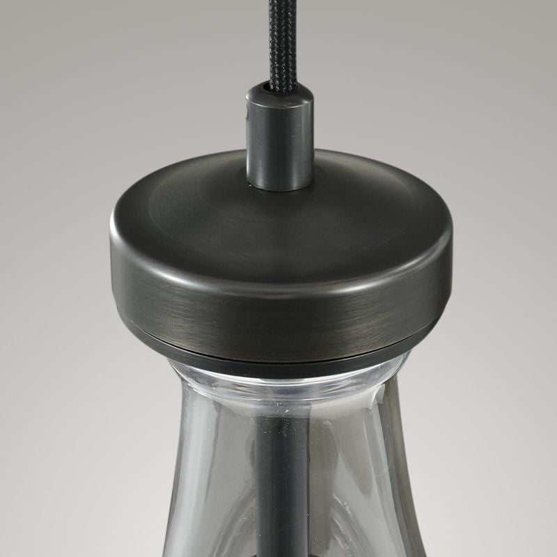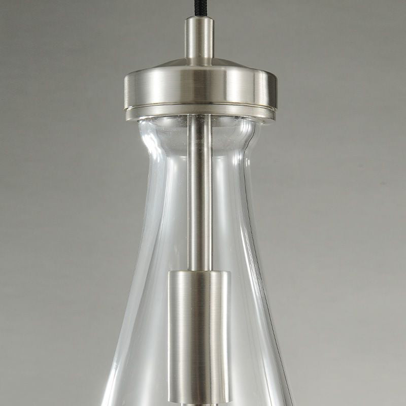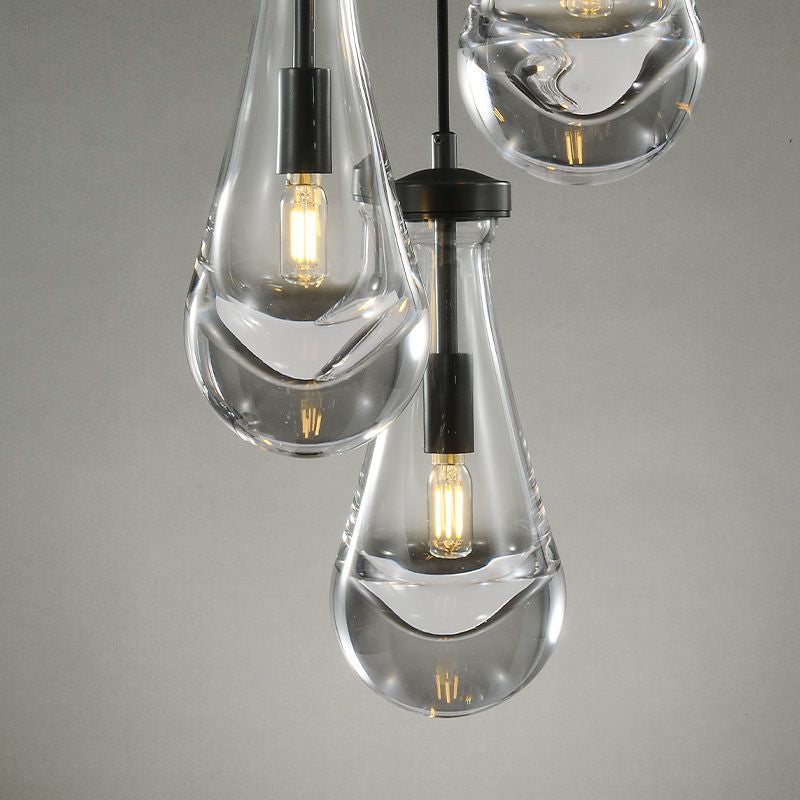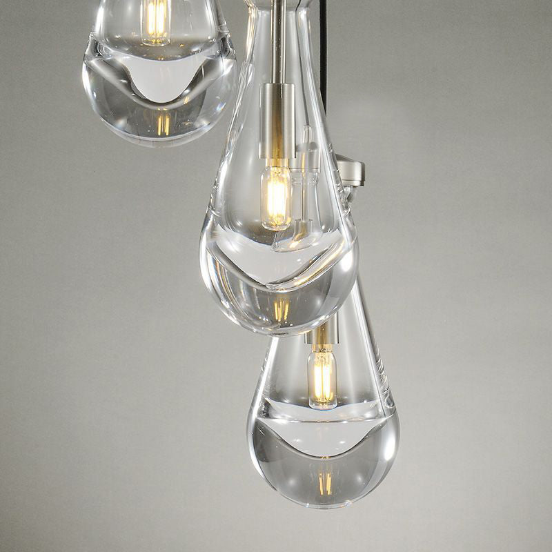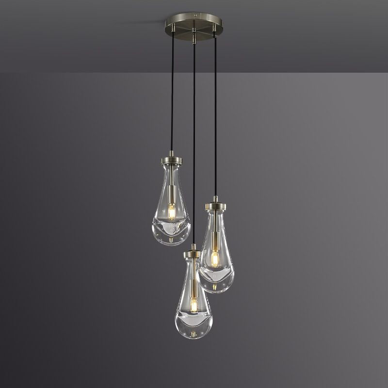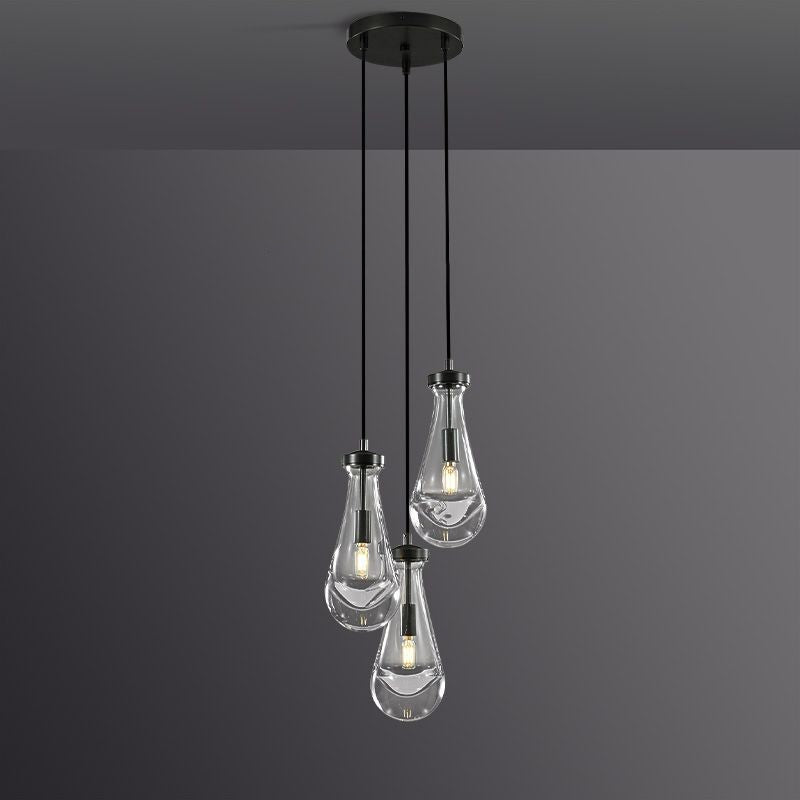 Much like the rhythm of a rainstorm itself. Suspended from slim black cords, drops of blown glass encase the bulbs - creating the illusion of underwater illumination - and cast luminous ripples that wash across ceilings and walls.