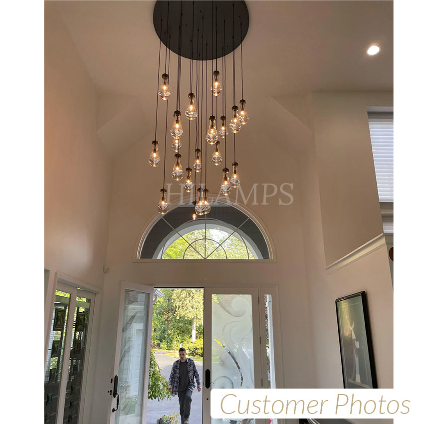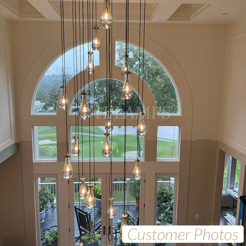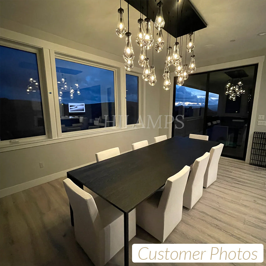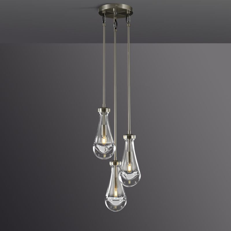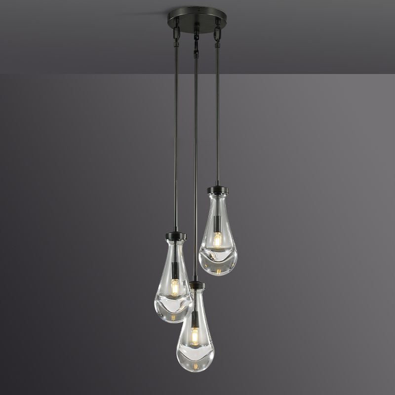 Much like the rhythm of a rainstorm itself. Suspended from slim black cords, drops of blown glass encase the bulbs - creating the illusion of underwater illumination - and cast luminous ripples that wash across ceilings and walls.