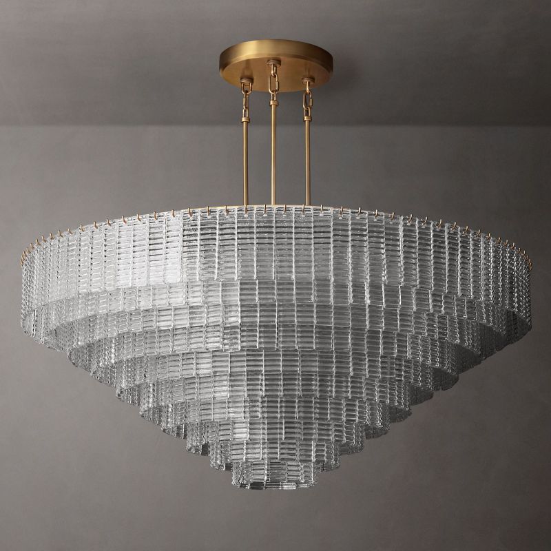 The collection's chandeliers combine traditional glassmaking techniques with modernist style. It is a study in geometric repetition, with textured ribbons of cast glass cascading in concentric circles, casting a warm glow to stunning effect.