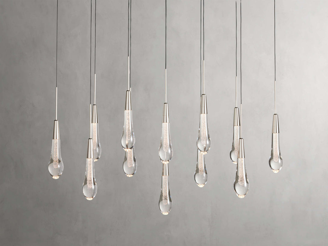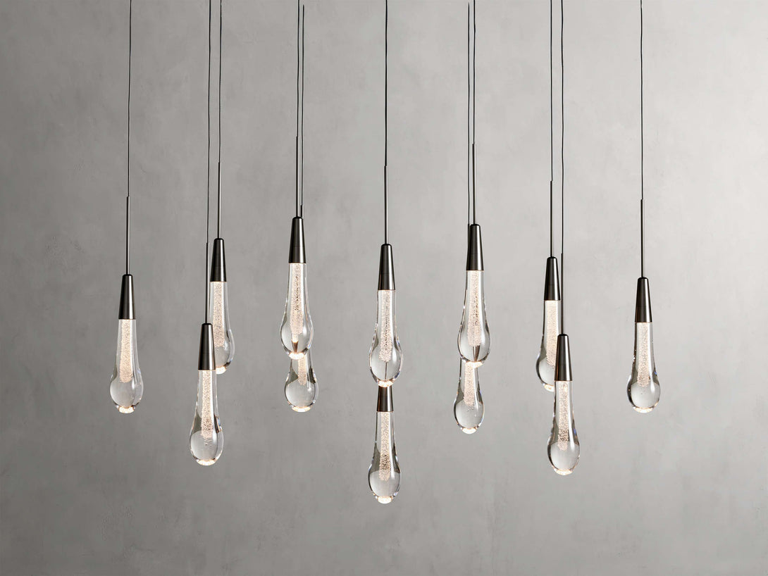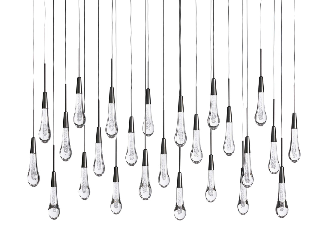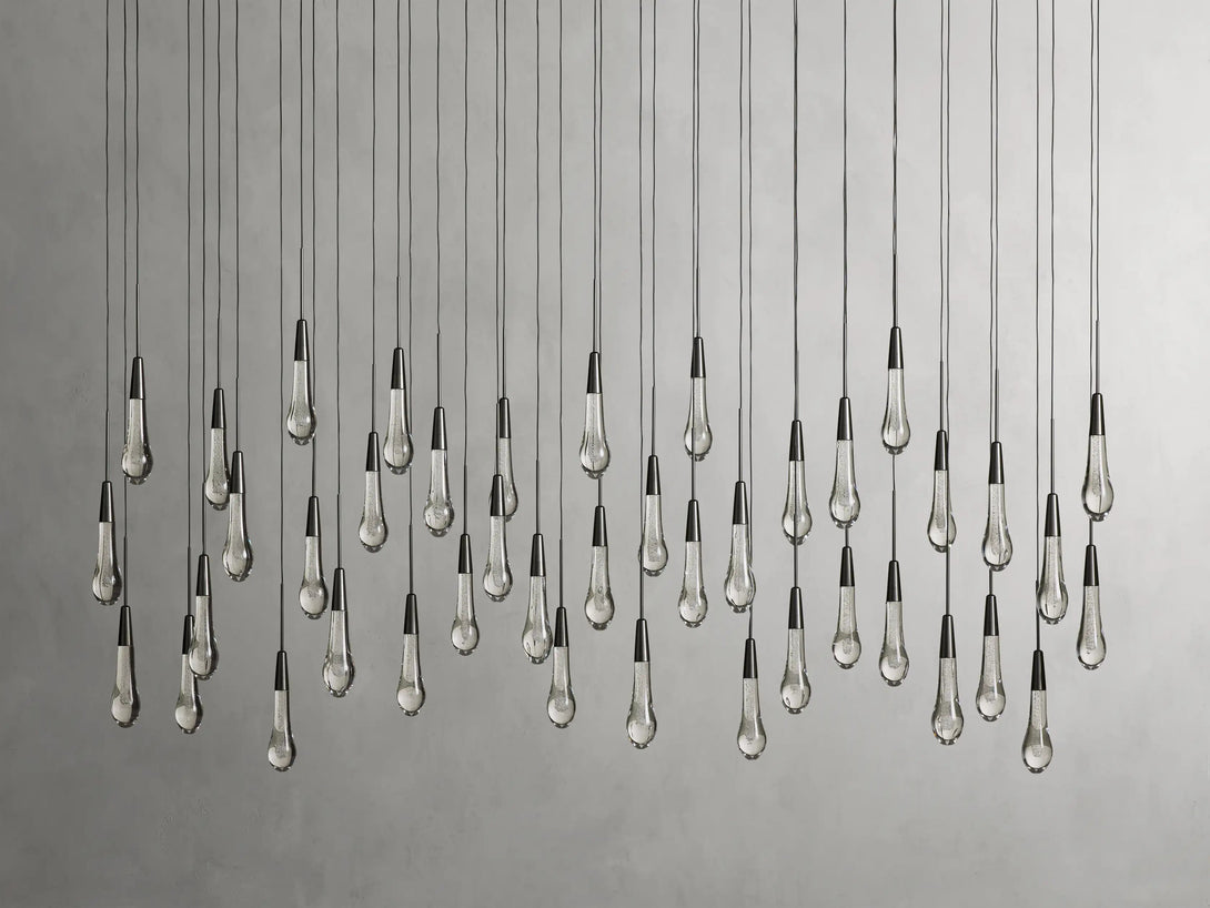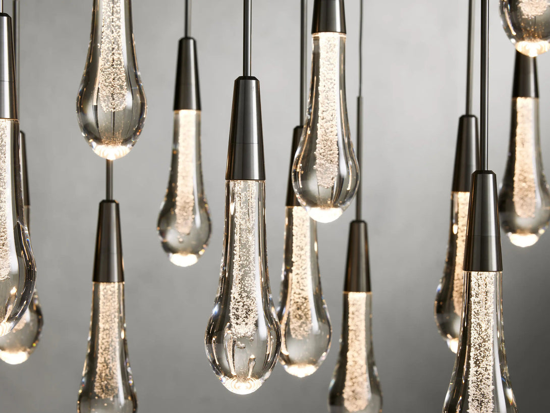 The Soltaire Collection features adjustable black PVC cords that cascade into integrated LED lights, handcrafted from seeded glass to mimic the look of falling raindrops. The elongated raindrop-shaped bulbs create a denser, more impactful visual effect. Available in brass, bronze, or nickel finishes, each fixture is coated with a clear lacquer for lasting beauty and protection.