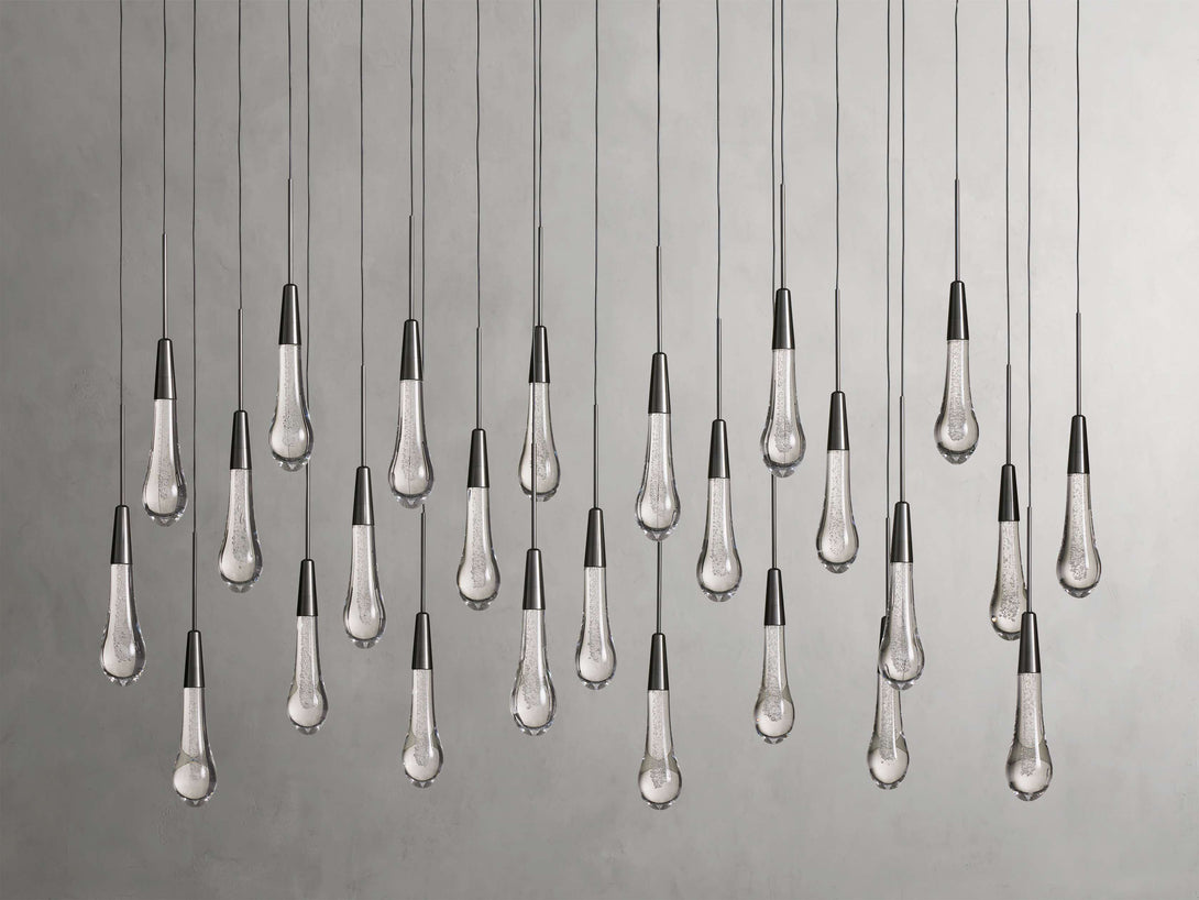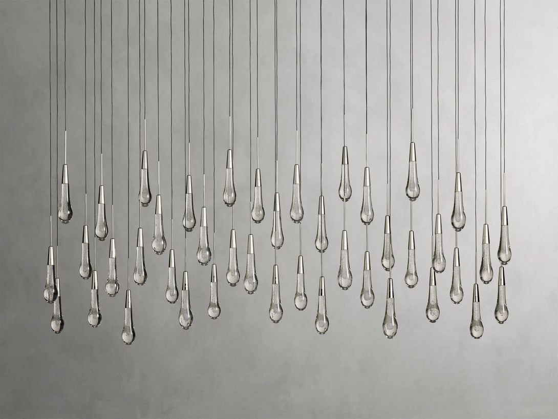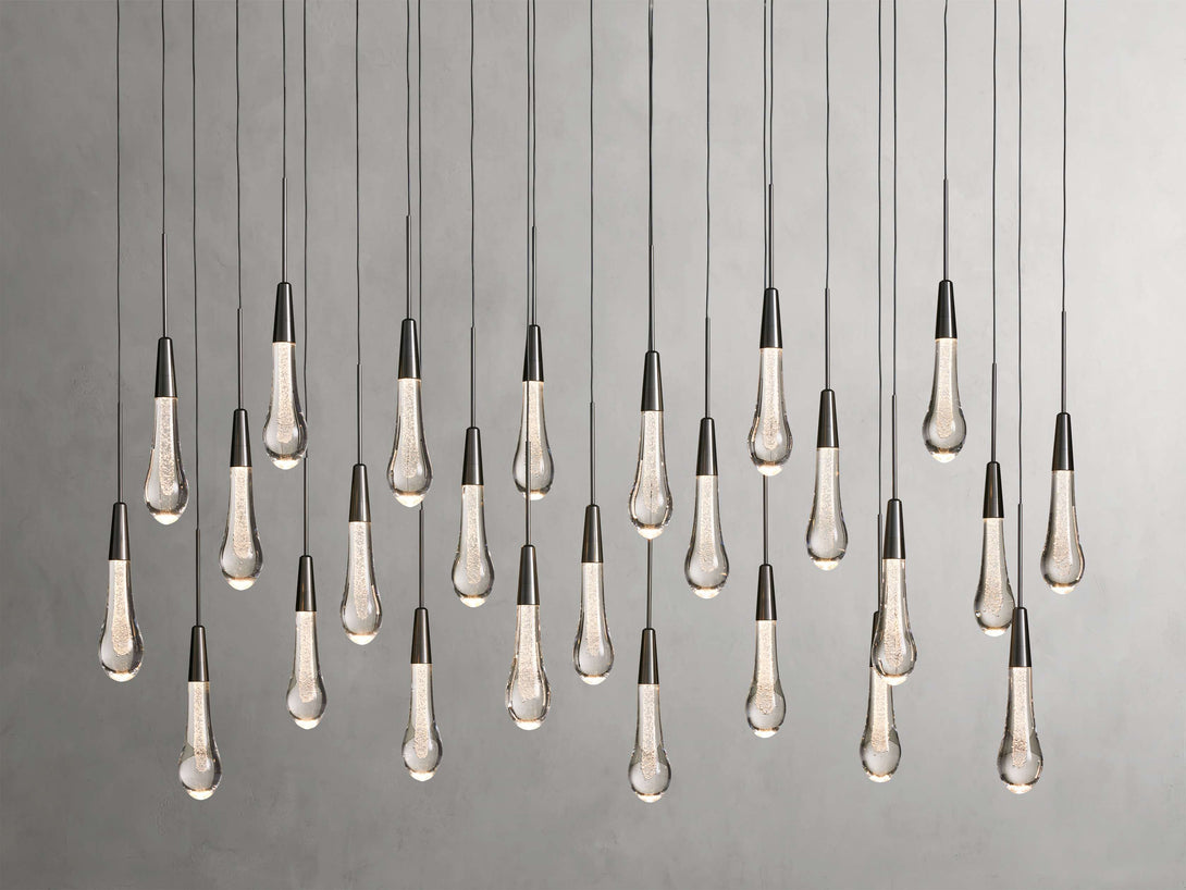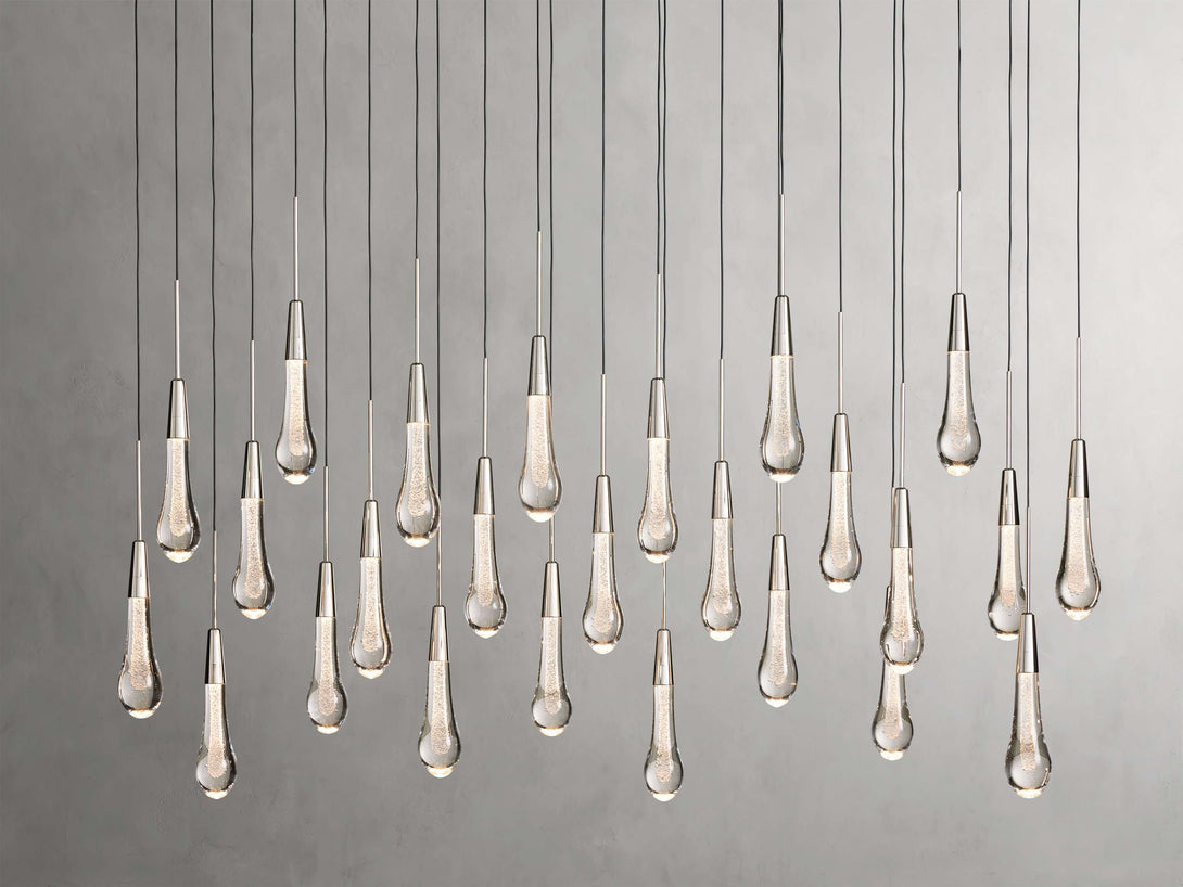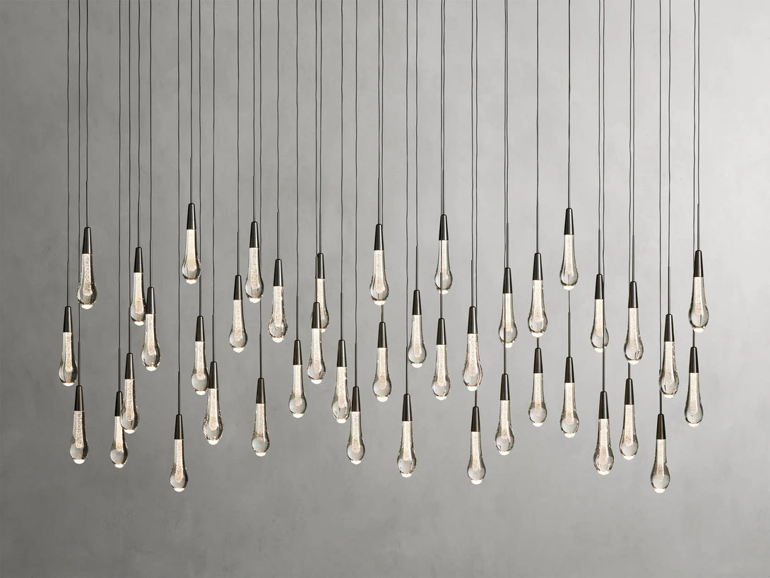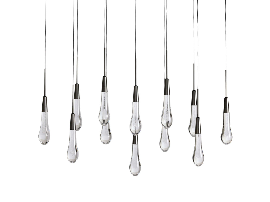 The Soltaire Collection features adjustable black PVC cords that cascade into integrated LED lights, handcrafted from seeded glass to mimic the look of falling raindrops. The elongated raindrop-shaped bulbs create a denser, more impactful visual effect. Available in brass, bronze, or nickel finishes, each fixture is coated with a clear lacquer for lasting beauty and protection.