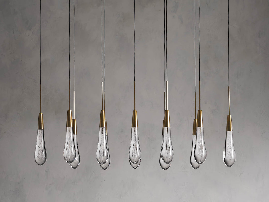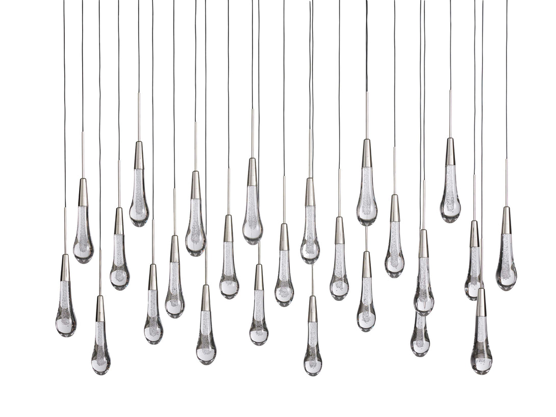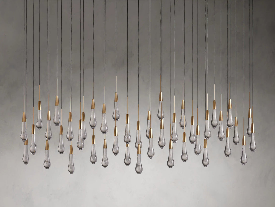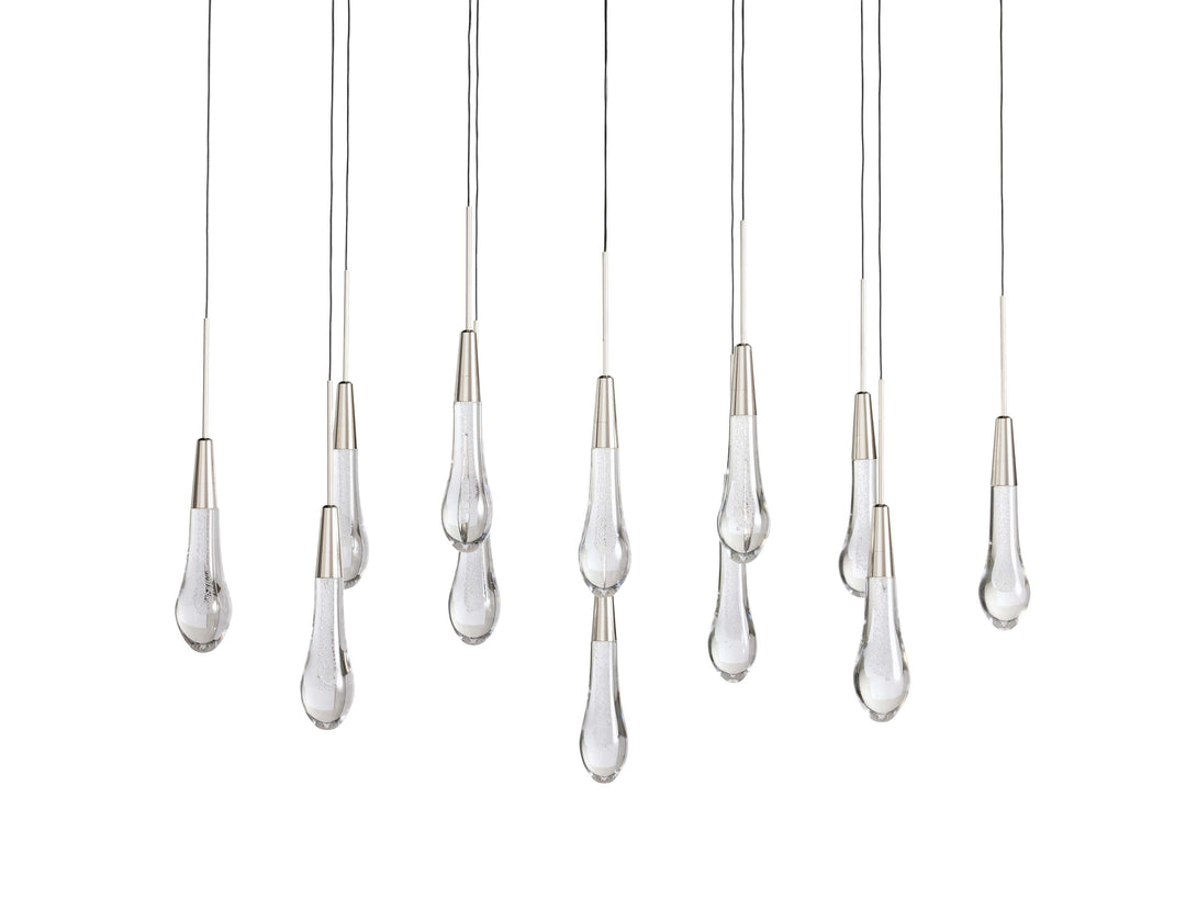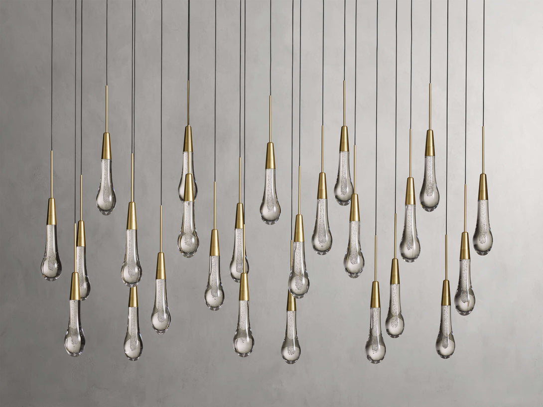 The Soltaire Collection features adjustable black PVC cords that cascade into integrated LED lights, handcrafted from seeded glass to mimic the look of falling raindrops. The elongated raindrop-shaped bulbs create a denser, more impactful visual effect. Available in brass, bronze, or nickel finishes, each fixture is coated with a clear lacquer for lasting beauty and protection.