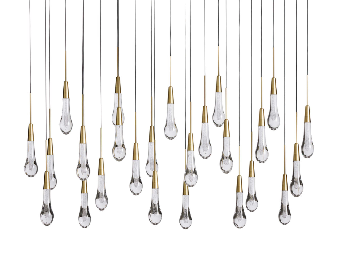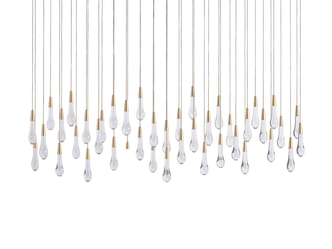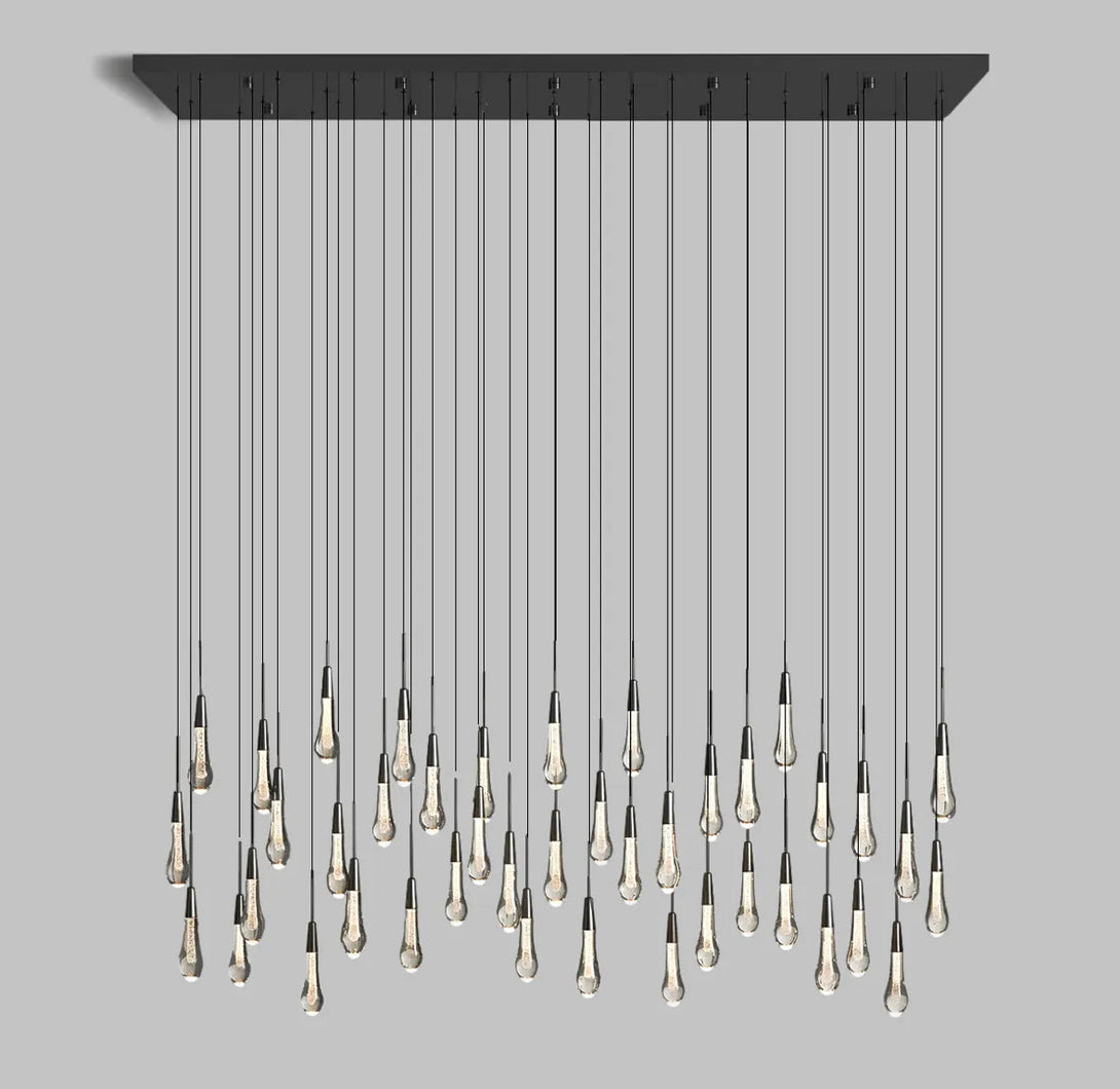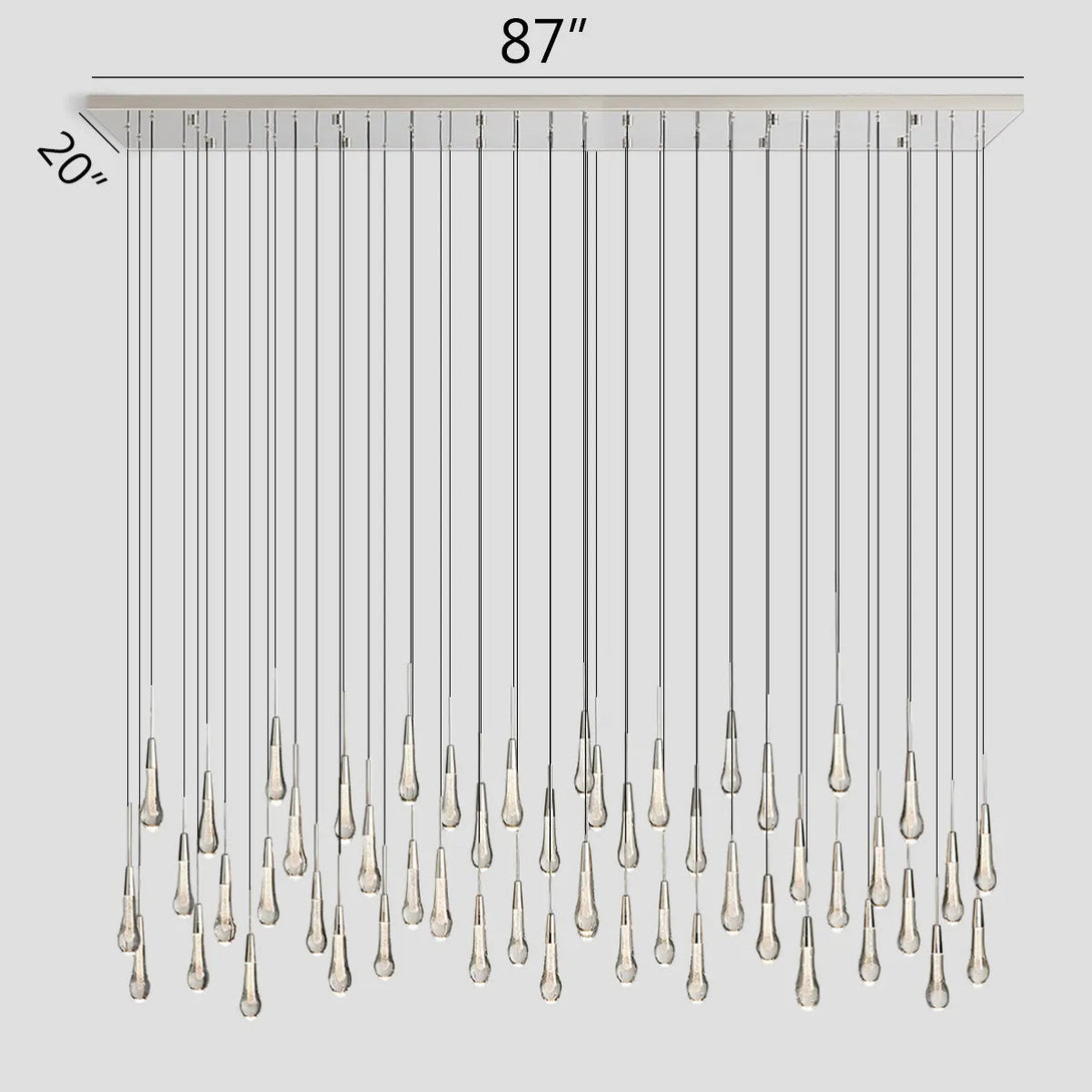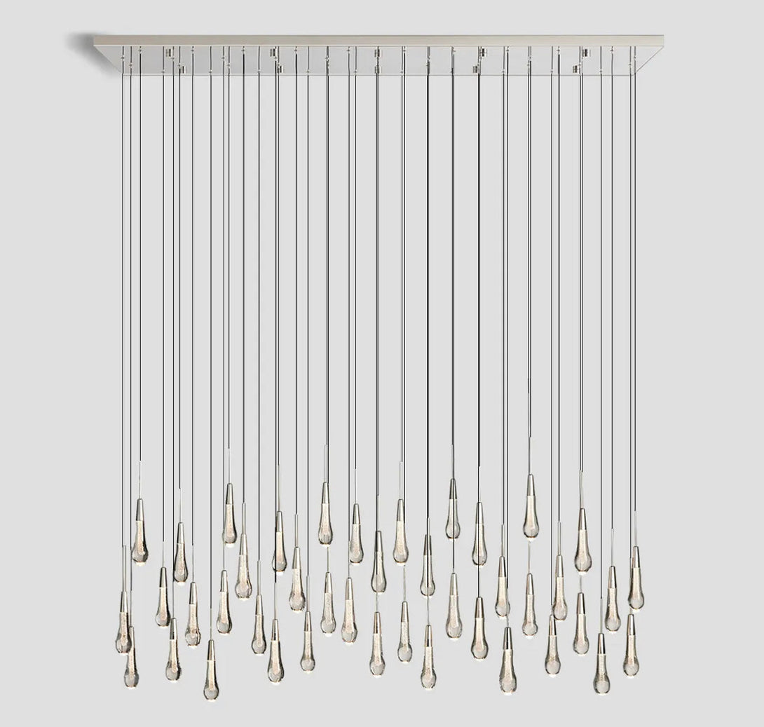 The Soltaire Collection features adjustable black PVC cords that cascade into integrated LED lights, handcrafted from seeded glass to mimic the look of falling raindrops. The elongated raindrop-shaped bulbs create a denser, more impactful visual effect. Available in brass, bronze, or nickel finishes, each fixture is coated with a clear lacquer for lasting beauty and protection.
