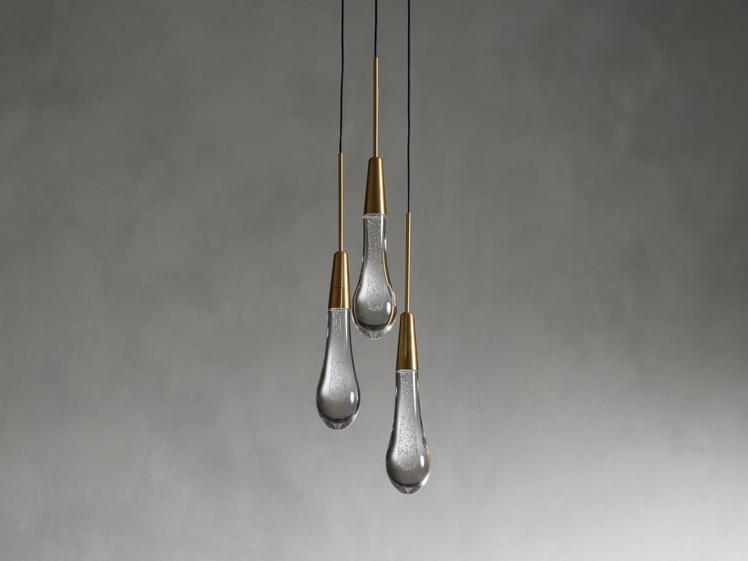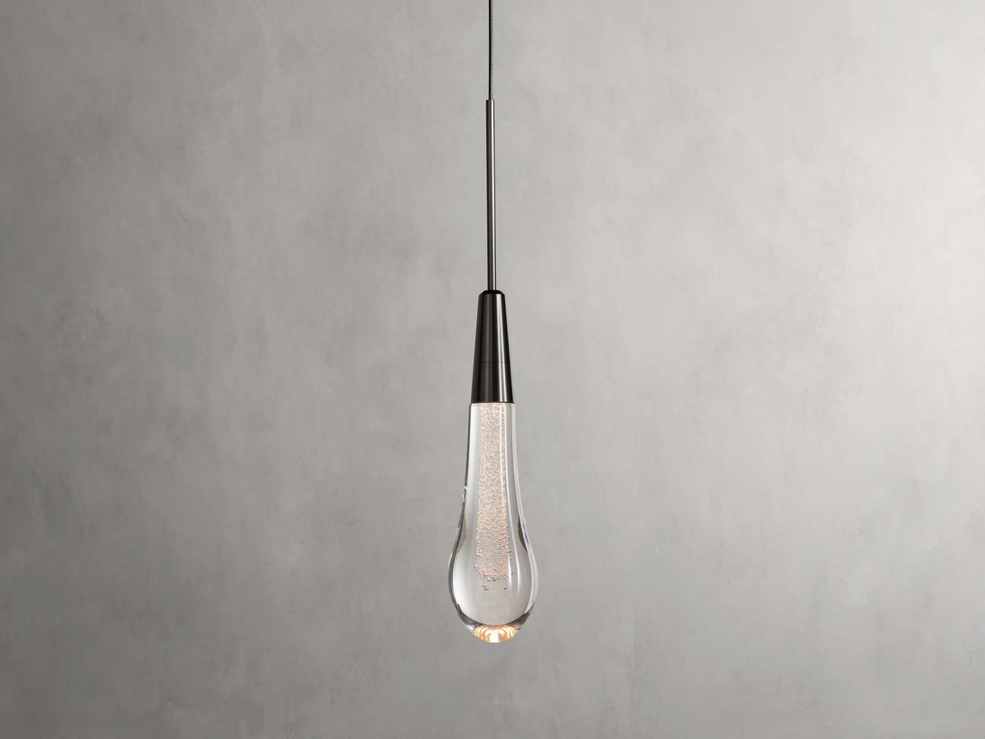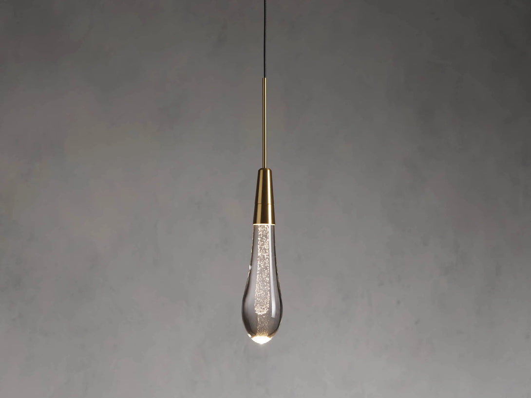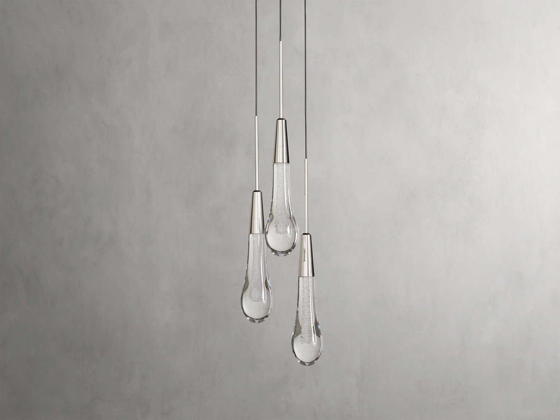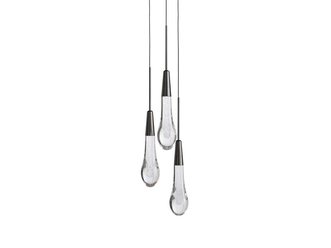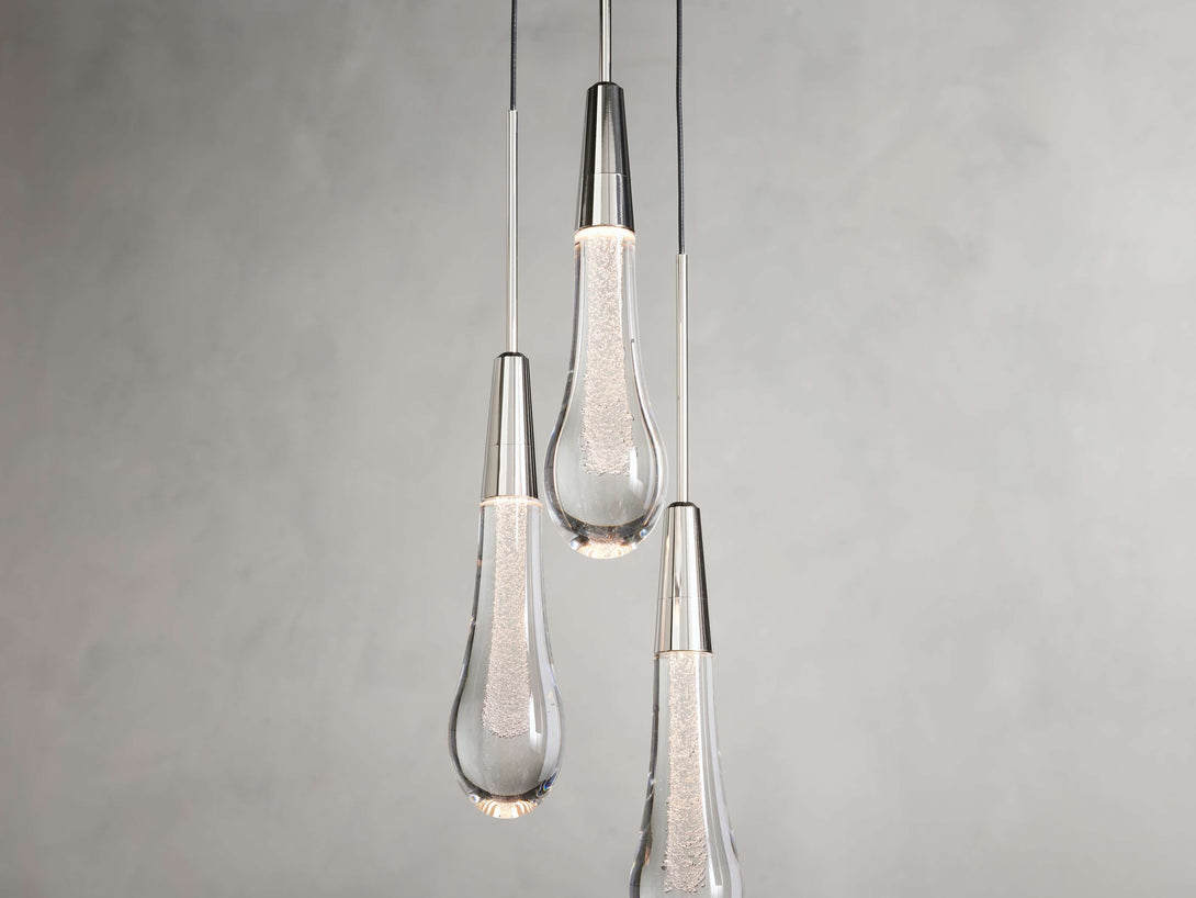 The Soltaire Collection features adjustable black PVC cords that cascade into integrated LED lights, handcrafted from seeded glass to mimic the look of falling raindrops. The elongated raindrop-shaped bulbs create a denser, more impactful visual effect. Available in brass, bronze, or nickel finishes, each fixture is coated with a clear lacquer for lasting beauty and protection.